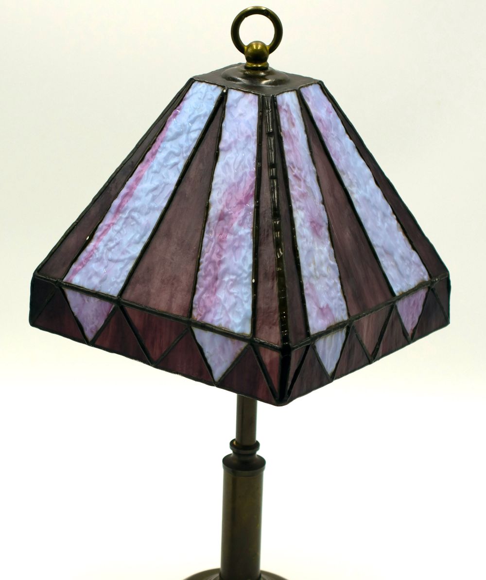 Questa lampada da tavolo in stile Tiffany è un'elegante lampada di design prodotta nella seconda metà del XX secolo, probabilmente alla fine degli anni Cinquanta. Design caratterizzato da una base in ottone e da uno splendido paralume in viola e bianco.