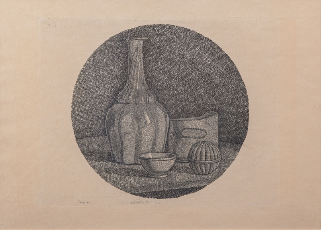 Grande natura morta circolare con bottiglie e tre oggetti (Large circular still life with bottles and three objects), 1946, etching
