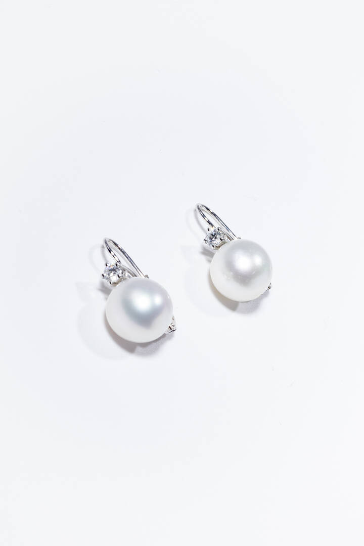 in oro bianco, a monachella, con due perle australiane del diam. di mm 12 ca, sormontate da due diamanti taglio brillante per totali ct 0,41 ca, probabile colore G-H, purezza IF-VVS.