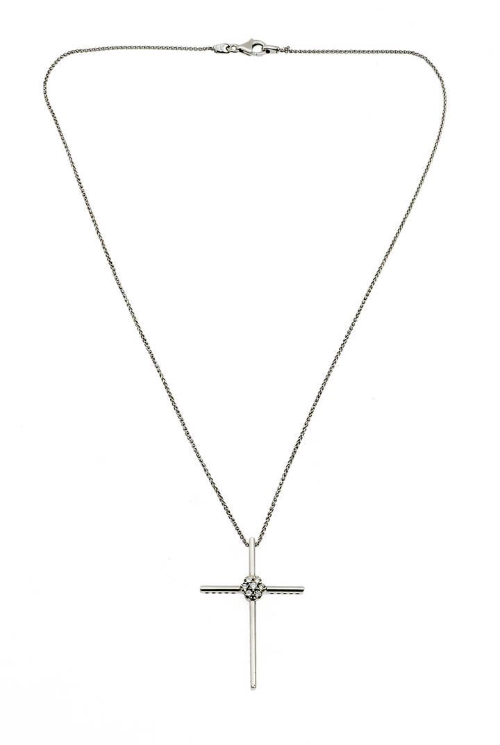 in oro bianco, a forma di croce, con al centro diamanti taglio brillante per totali ct 0,14 ca.