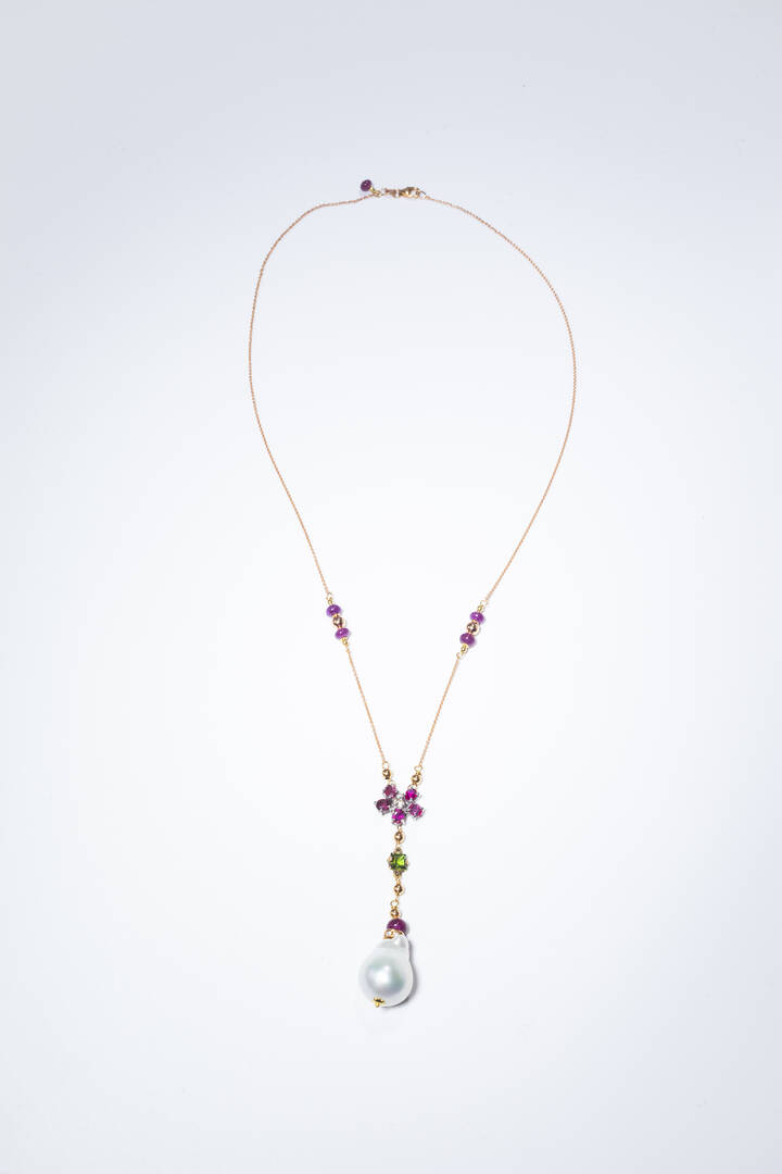 in oro rosa e bianco con dischi di rubini, olivina taglio fantasia e grande perla australiana scaramazza del diam. di mm 14 ca. Diamanti taglio brillante per totali ct 0,10 ca.