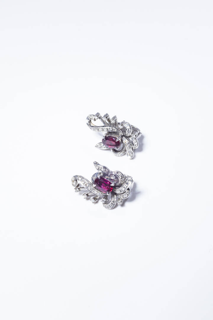 in oro bianco, a clip, anni '50, a forma di volute in diamanti taglio 8/8 per totali ct 0,50 ca e due rubini taglio ovale per totali ct 2,30 ca.
