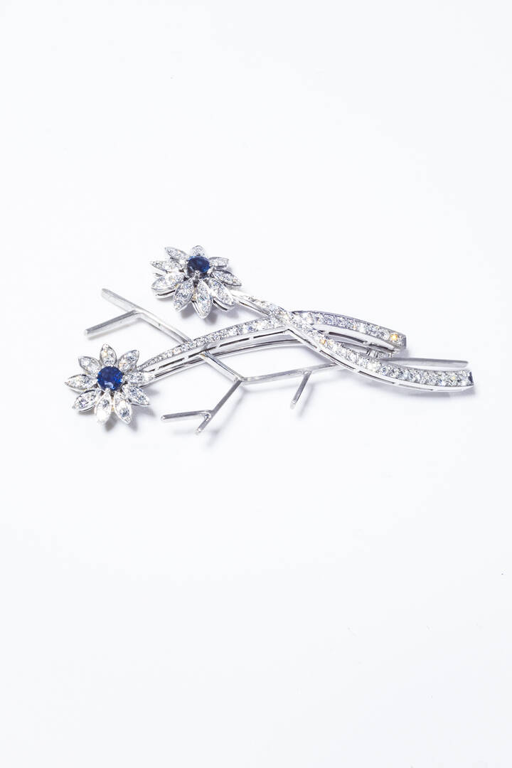 Spilla in palladio, firmata "Cirio-Bonisoli", a forma di fiori stilizzati con due zaffiri taglio rotondo per totali ct 0,41 e diamanti taglio brillante per totali ct 1,14 ca, probabile colore G-H.