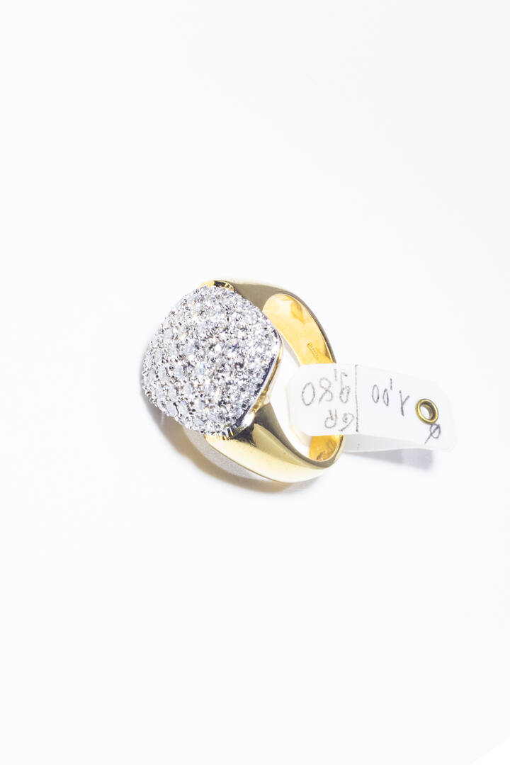 in oro giallo e bianco, sommità romboidale con pavé di diamanti taglio brillante per totali ct 1,0 ca, probabile colore G-H, purezza IF-VVS.