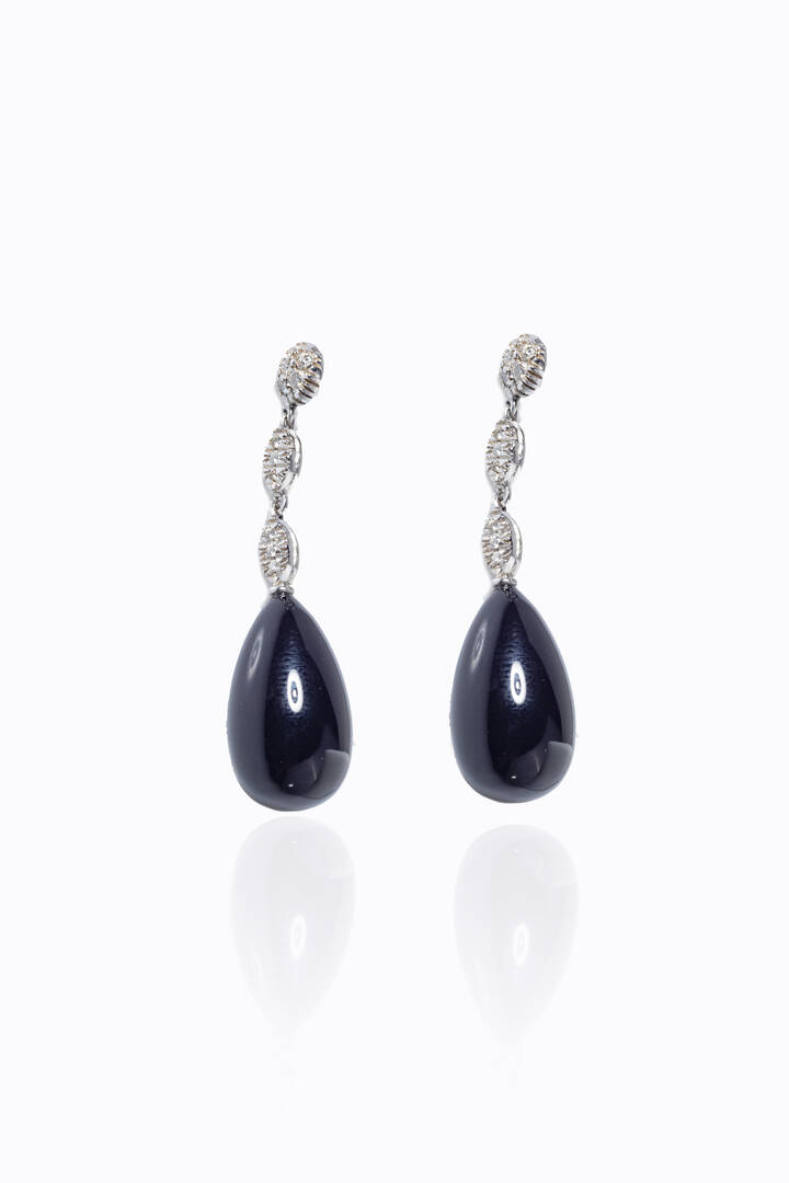 pendenti, in oro bianco, corpo in diamanti taglio brillante per totali ct 0,15 ca, terminanti con due gocce in onice.