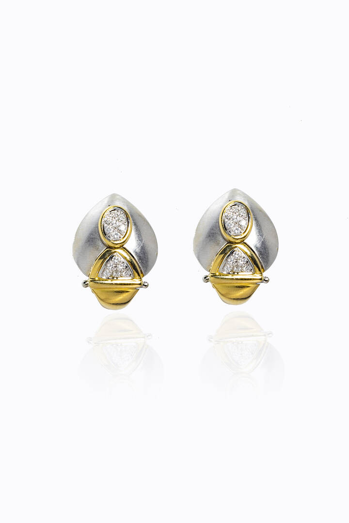 in oro giallo e bianco satinato, a forma di goccia, con diamanti taglio brillante per totali ct 0,25 ca