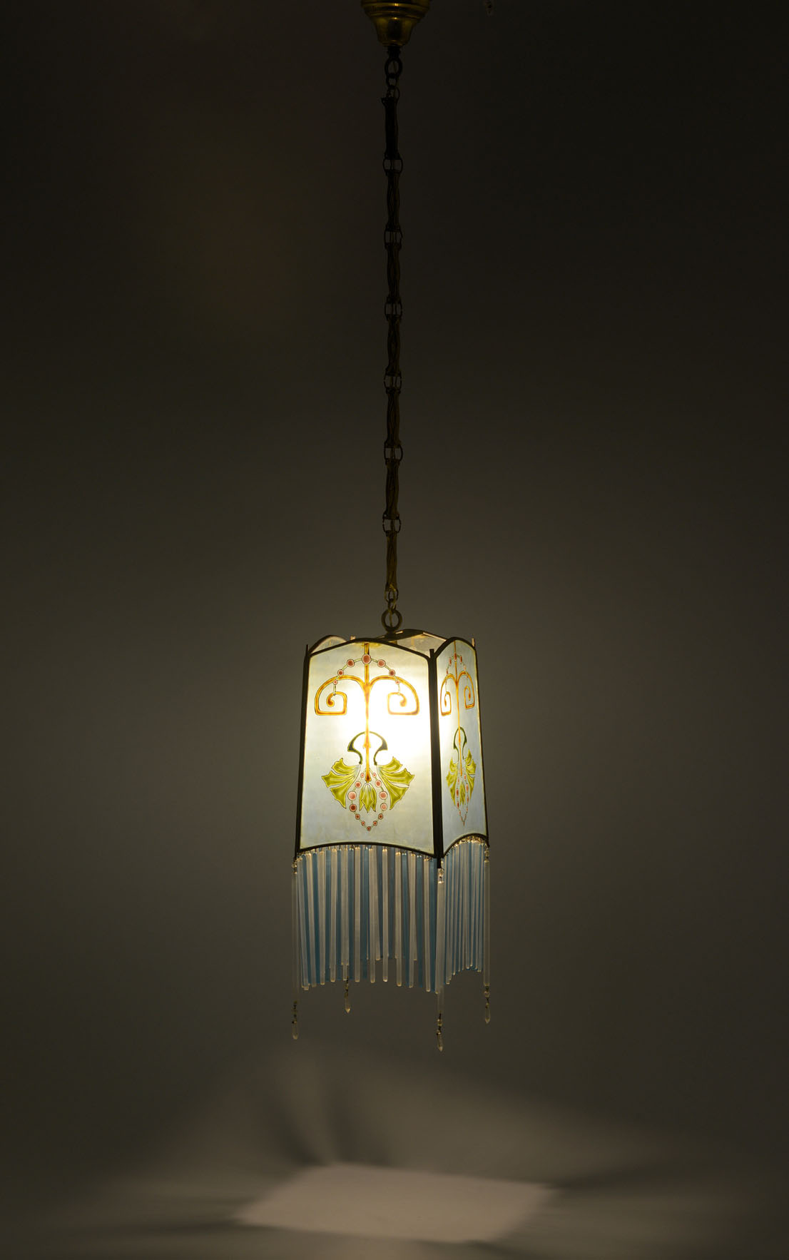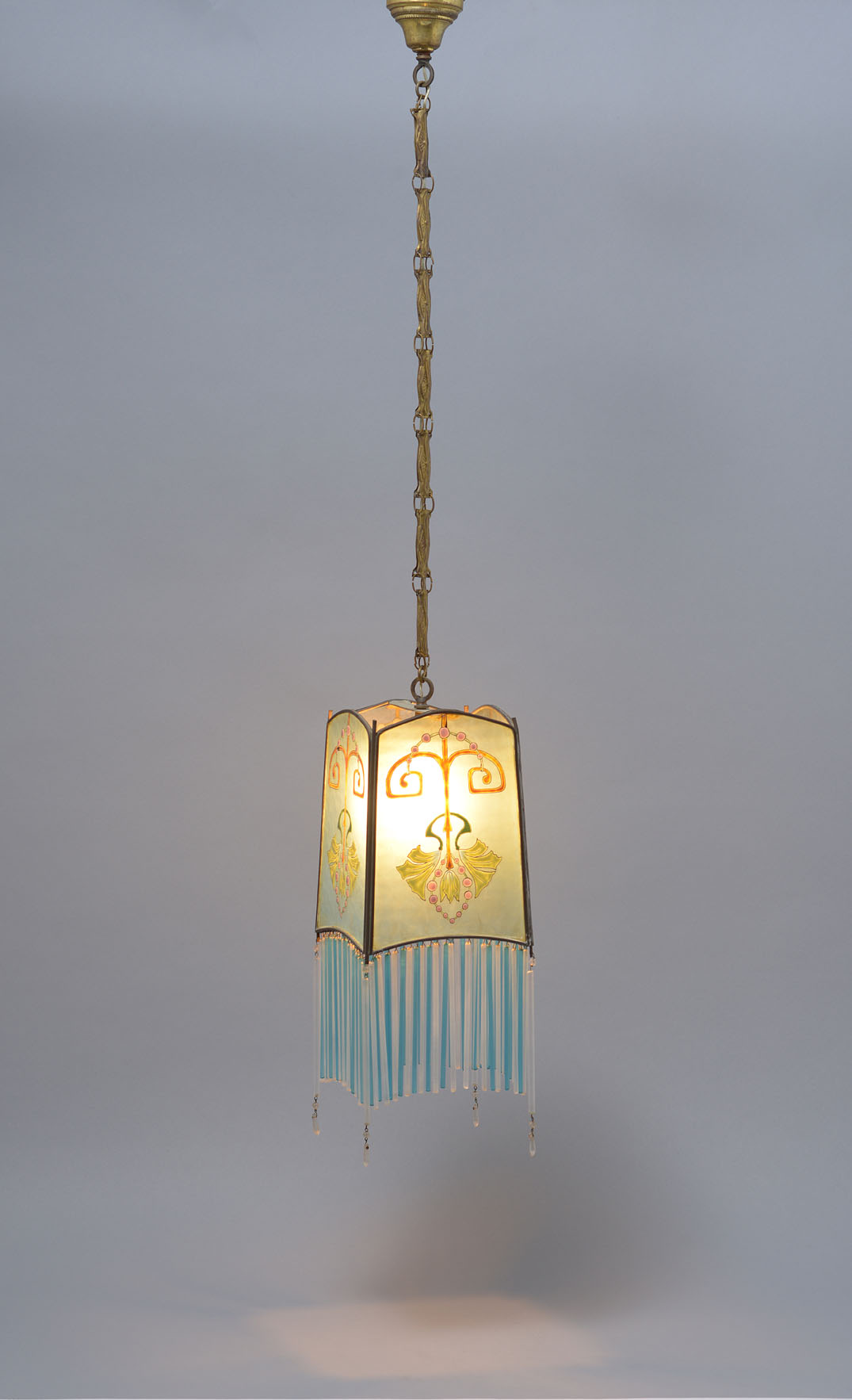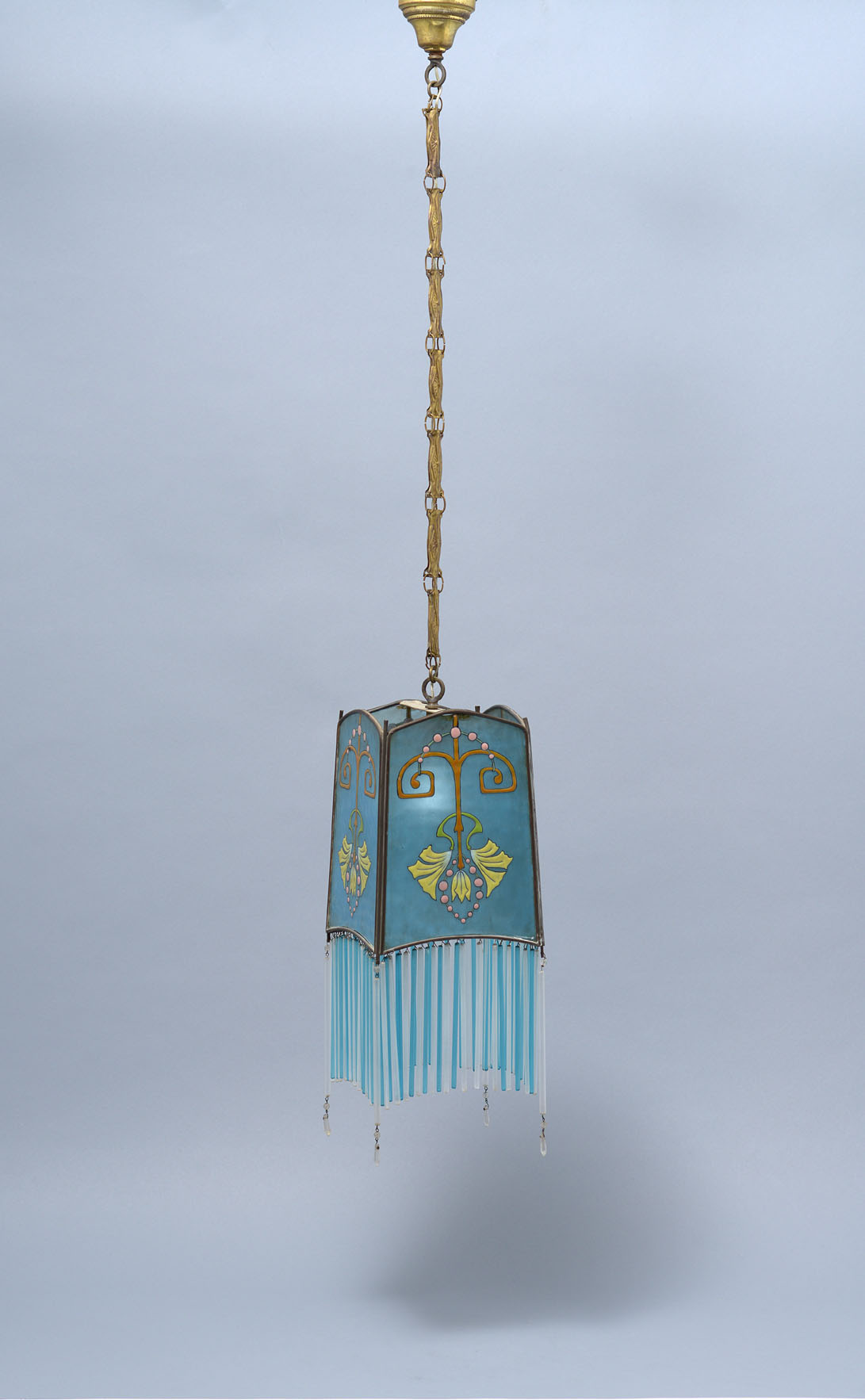 A small blue glass lantern-shaped chandelier with polychrome enamel floral decoration. The circumference is decorated with transparent and blue frosted glass thin tubes. Original brass link chain.