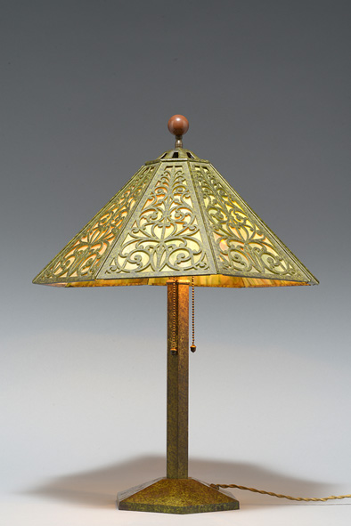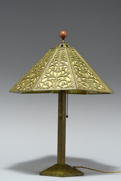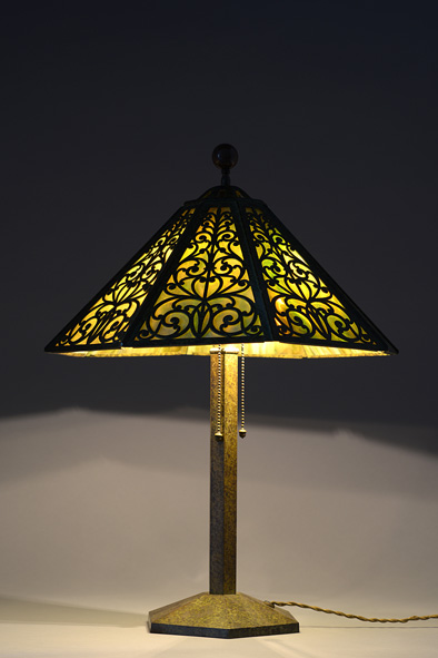 A table lamp with metal base and stem. Umbrella-shaped metal diffuser decorated with arabesque patterns and divided into six sections in which there are six sheets of marbled glass of greenish tones. Bakelite sphere at tip. Two chains to turn on the two lights separately.