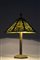 A table lamp with metal base and stem. Umbrella-shaped metal diffuser decorated with arabesque patterns and divided into six sections in which there are six sheets of marbled glass of greenish tones. Bakelite sphere at tip. Two chains to turn on the two lights separately.