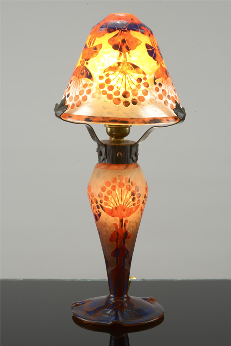 Stylised umbellifers, acid etched cameo motif in red and orange powder mottled blue, clearly marked, on satin opal white ground with orange smoky tones. Signed "Le Verre Français" on foot.