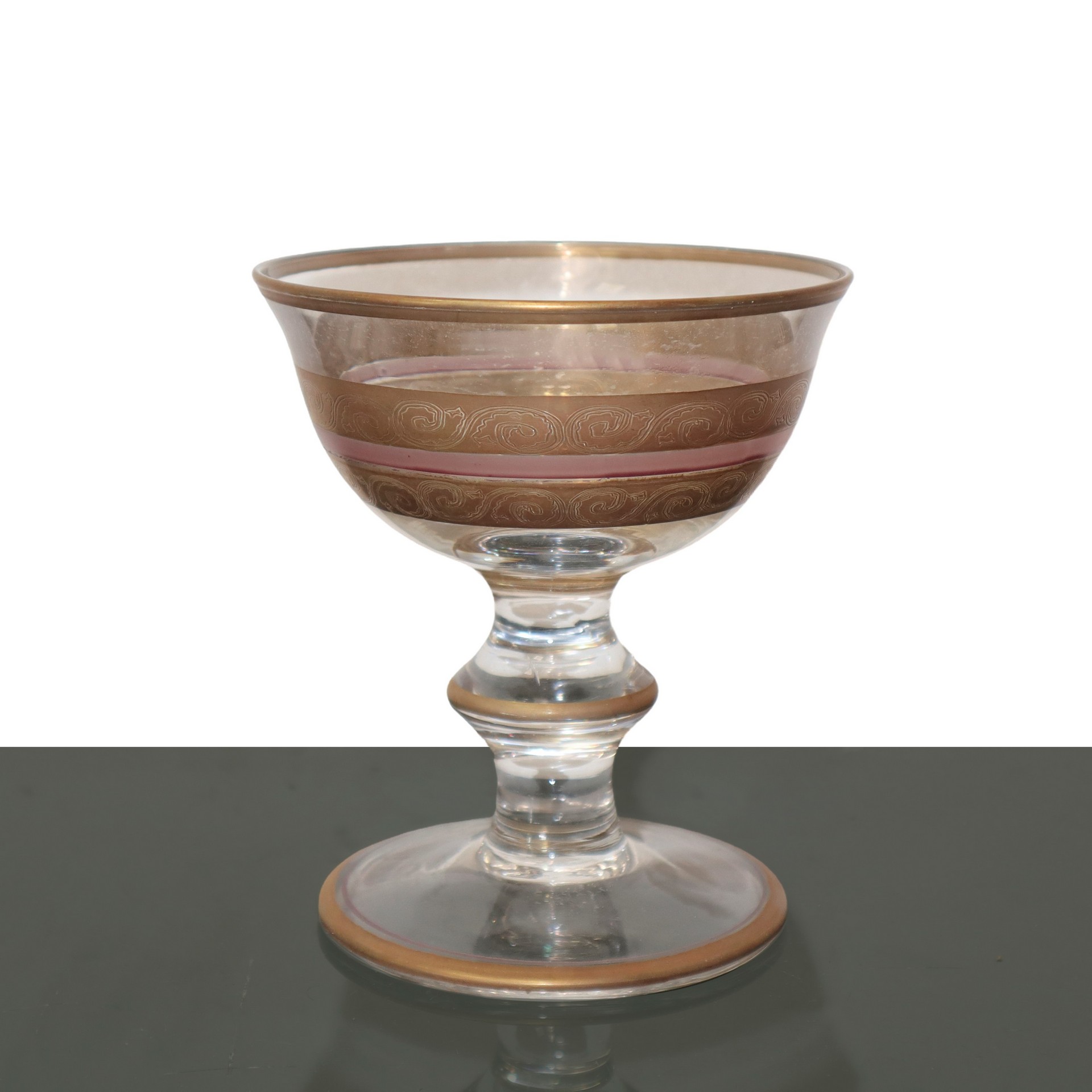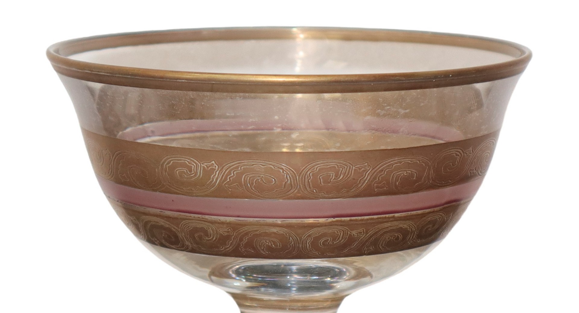 Servizio di bicchieri da 12 in vetro di Murano con dettaglio in oro e rosa.