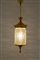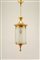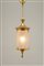 A brass and gilt aluminium suspension lamp with frosted effect acid-etched glass diffuser.