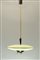 A brass, metal and green opaline glass ceiling lamp in the shape of a flying saucer, typical of the 1950's production when regular reference was made to the space era. Bowl and upper glass damaged.