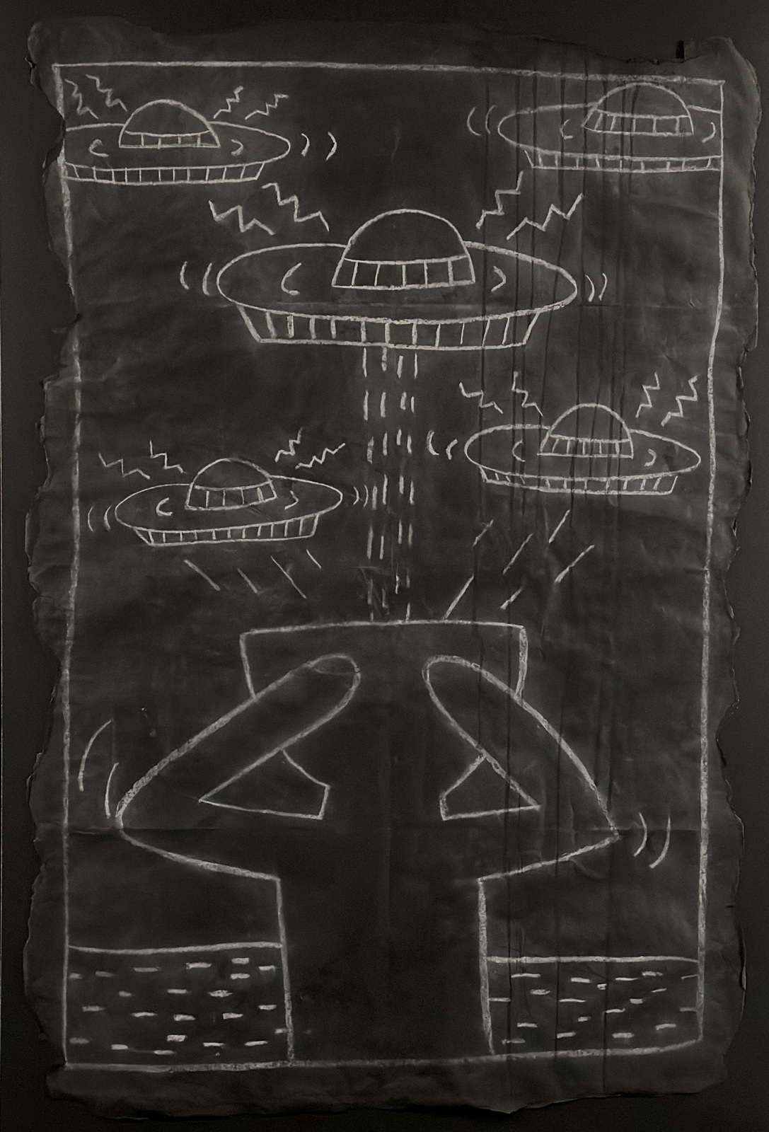 Opera proveniente dal ciclo dei "Subway drawings" : le prime opere in gessetto realizzate, a New York nei primi anni'80, sulle affissioni in carta di colore nero che coprivano le pubblicità scadute.