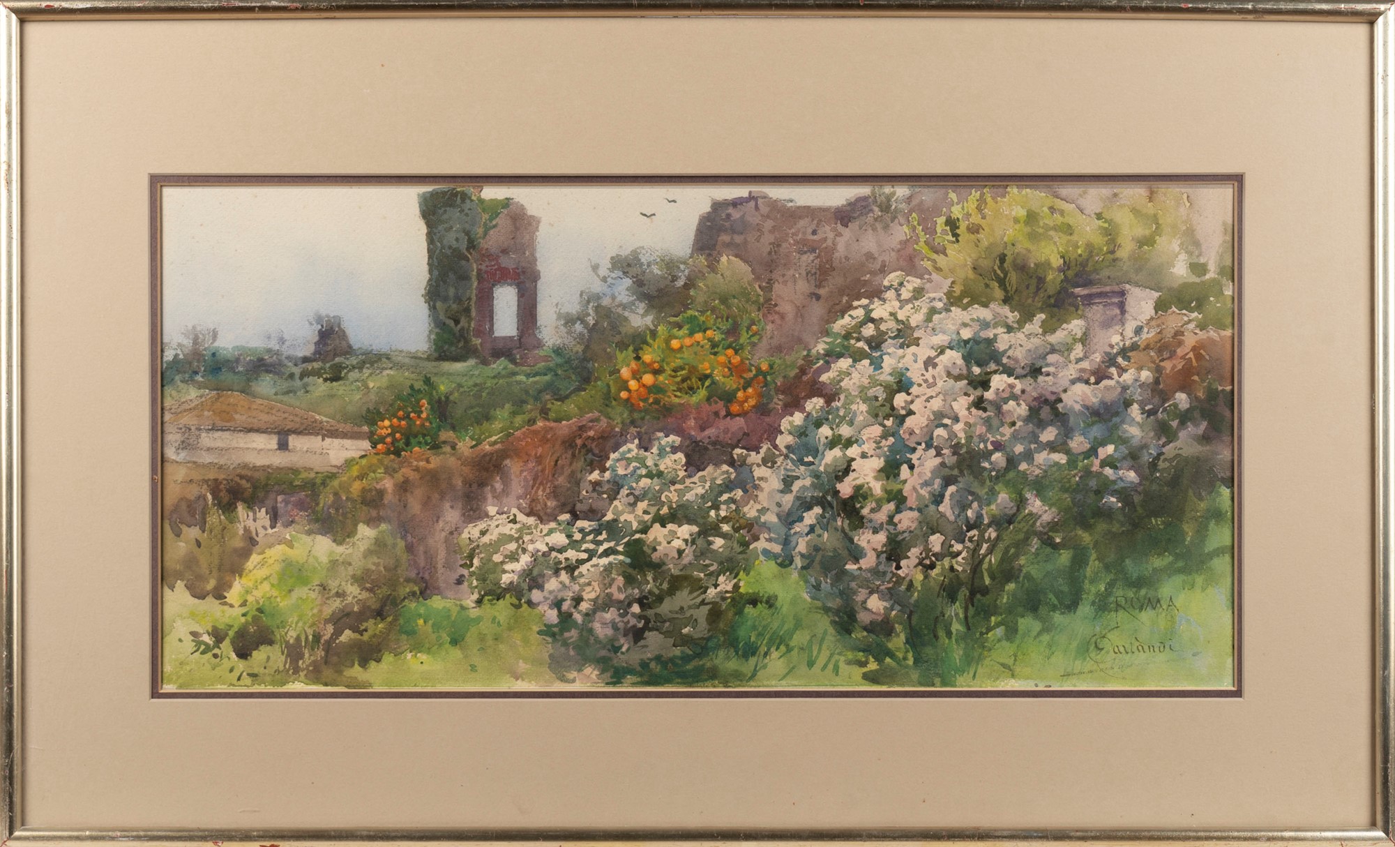 Lot 105 | Onorato Carlandi (Roma 1848-1939) - Ruderi romani con aranci e oleandri in fiore