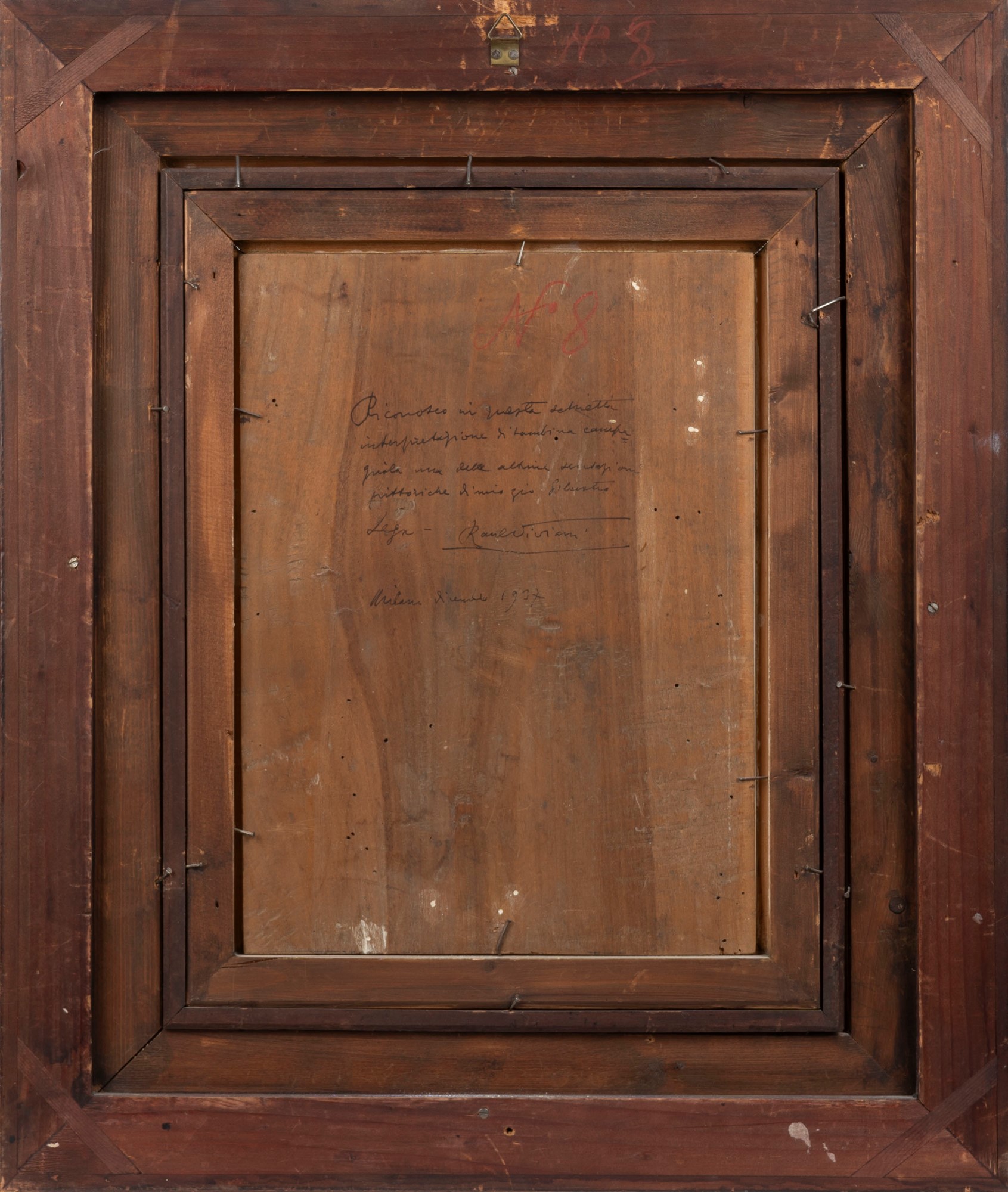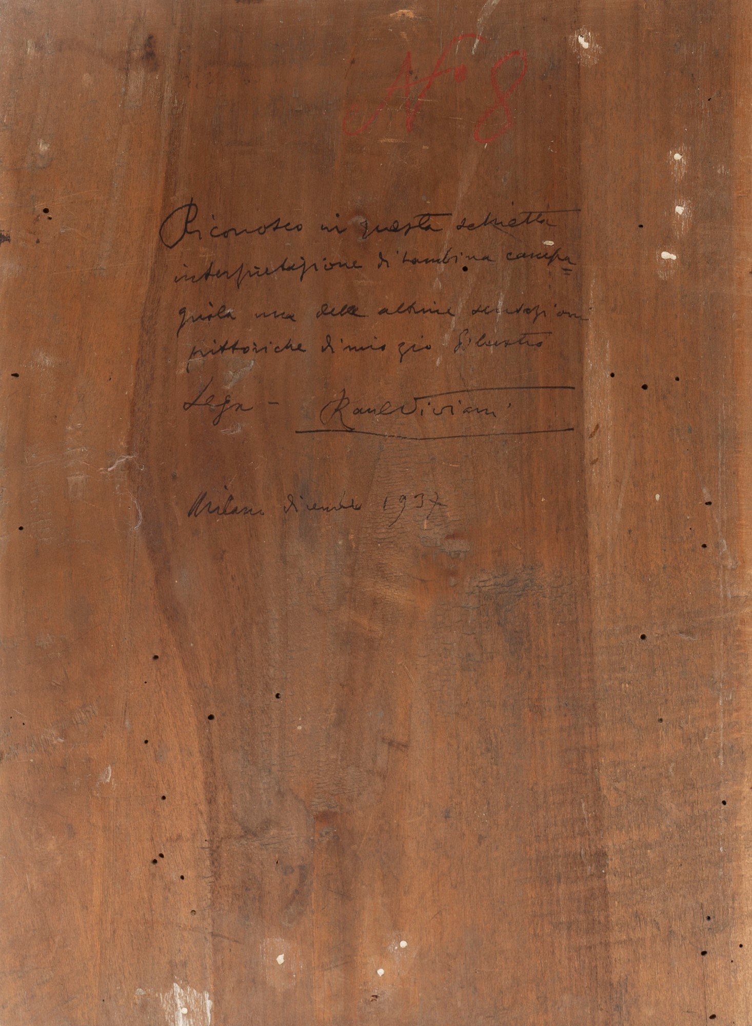 Sul retro, sulla tavola: dichiarazione di autenticità manoscritta: Riconosco in questa schietta / interpretazione di bambina campa- / gnola una delle ultime decorazioni / pittoriche di mio zio Silvestro / Lega. Raul Viviani / Milano dicembre 1937 ; antico numero di riferimento: N° 8.