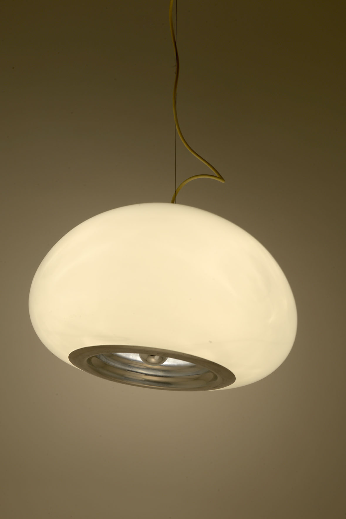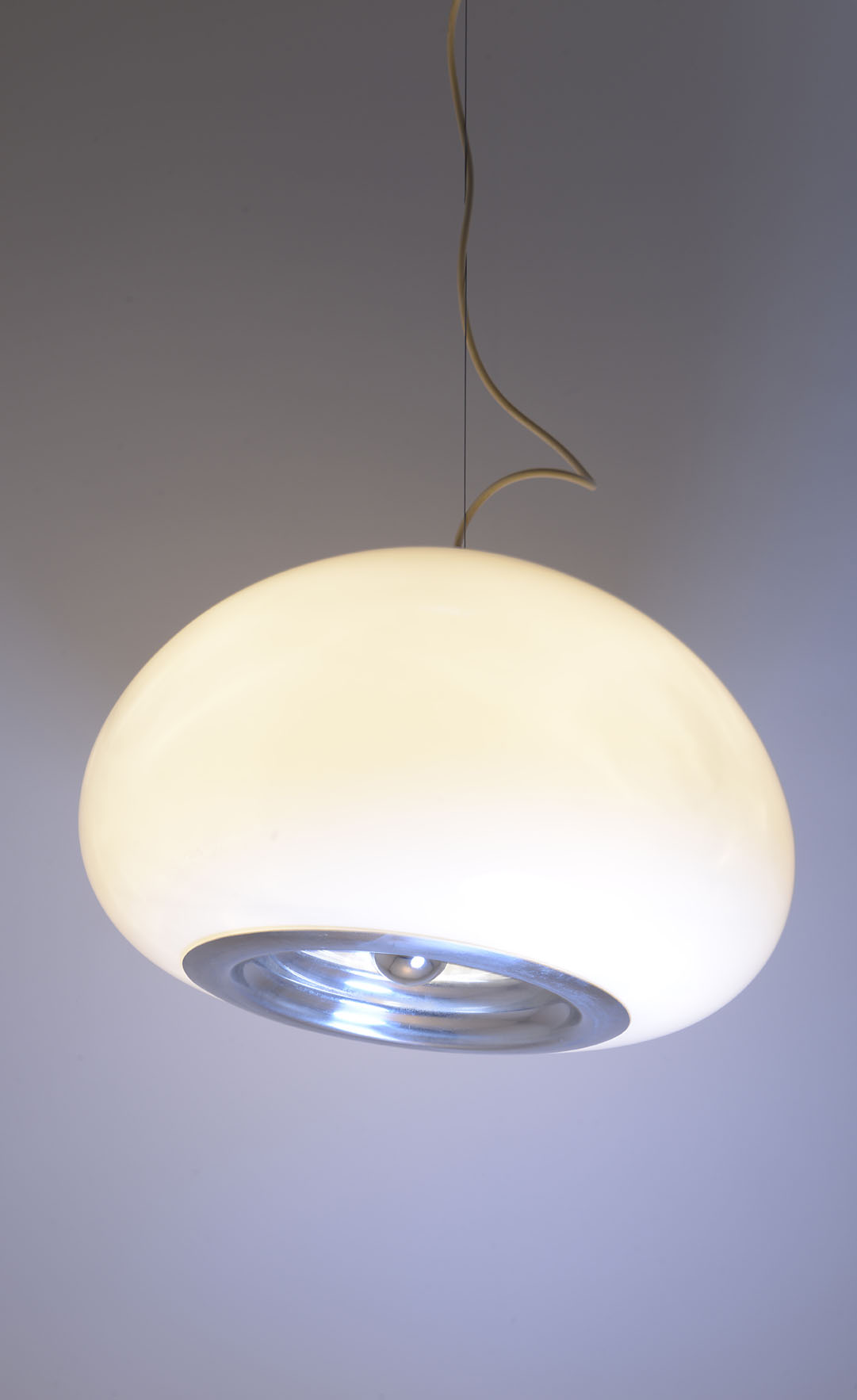 A glass and aluminium variant of the Splügen Bräu lamp, producing direct and diffused light in the various combinations. Three bulbs within the opal white glass diffuser and a down-turned silver-plated topped surface bulb, are set within the corrugated aluminium calotte. Its name comes from the back and white effect created when the glass part is turned on with diffused light and the lower part is switched off.