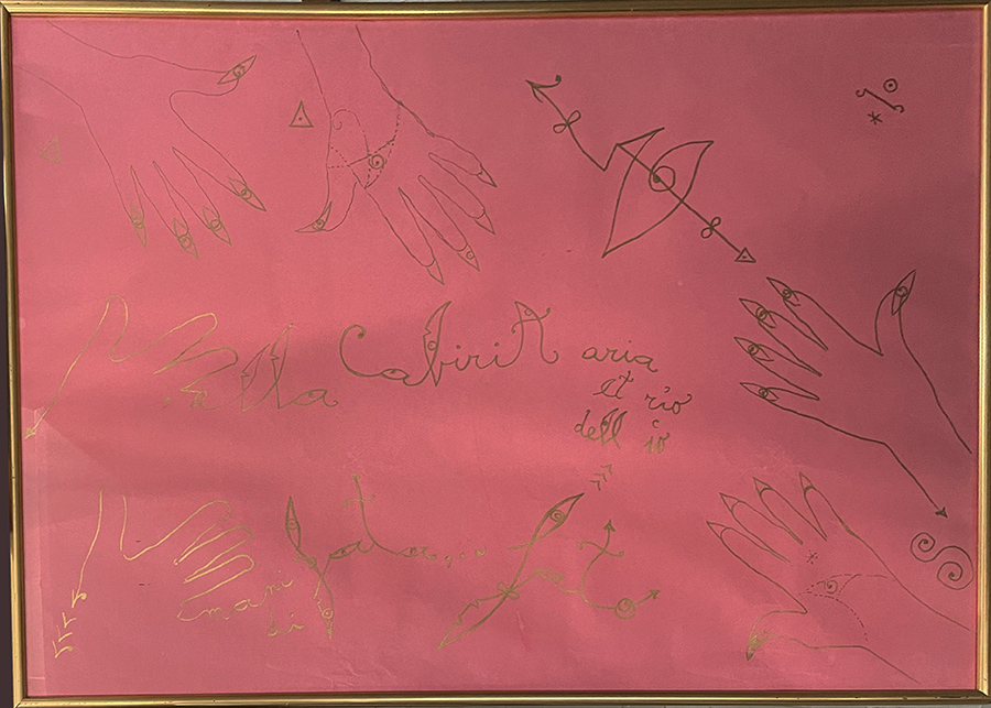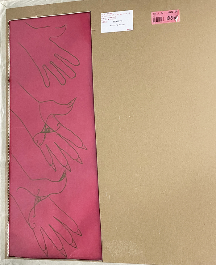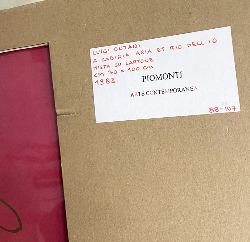 LUIGI ONTANI, "A Cabiria aria et rio dell io", 1988, pennarello su cartoncino, dim 70x100. Al verso: etichetta Piomonti Arte Contemporanea: nome autore, titolo, tecnica dimensioni, anno; etichetta rosa con dimensioni. Opera con cornice.