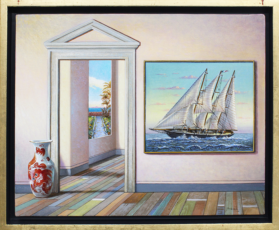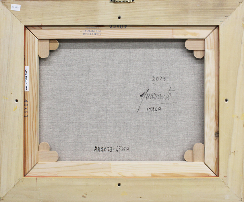 ANTONIO NUNZIANTE, "ITACA", 2023, olio su tela, dim 40x50, archivio Nunziante n° di archiviazione AN2023-4375A in data 30/08/2023. Al fronte: firma in basso a destra. Al verso: in basso a sinistra numero di archiviazione, firma, anno, titolo al centro a destra. Opera con cornice.