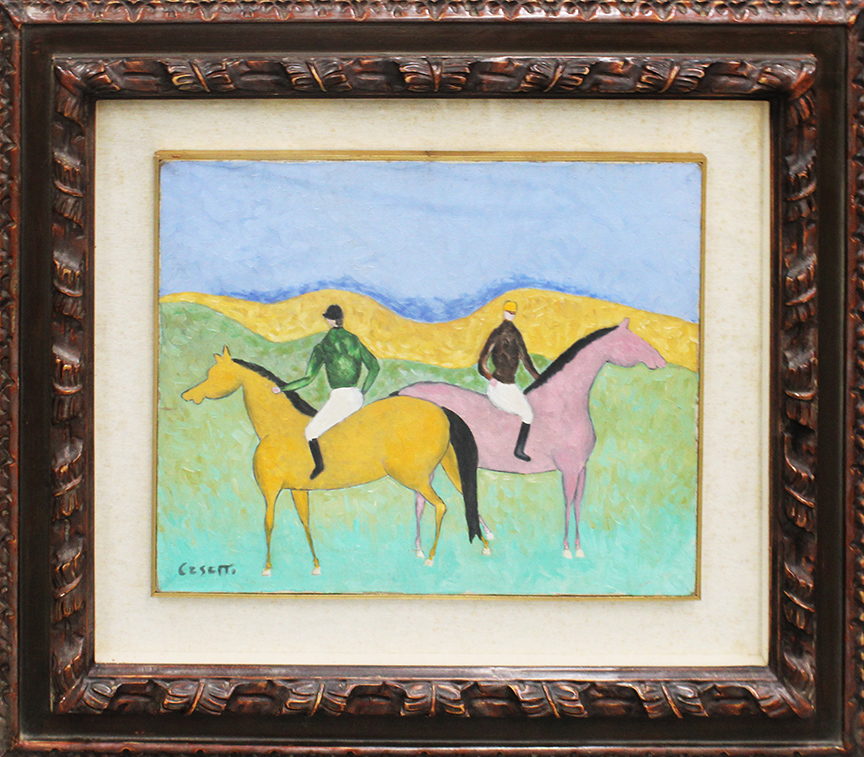 GIUSEPPE CESETTI, Anni '80, (Cavallerizzi a cavallo), Olio su tela, Dim. 50x40, Al fronte: firma in basso a sinistra, Opera con autentica. Opera con cornice.