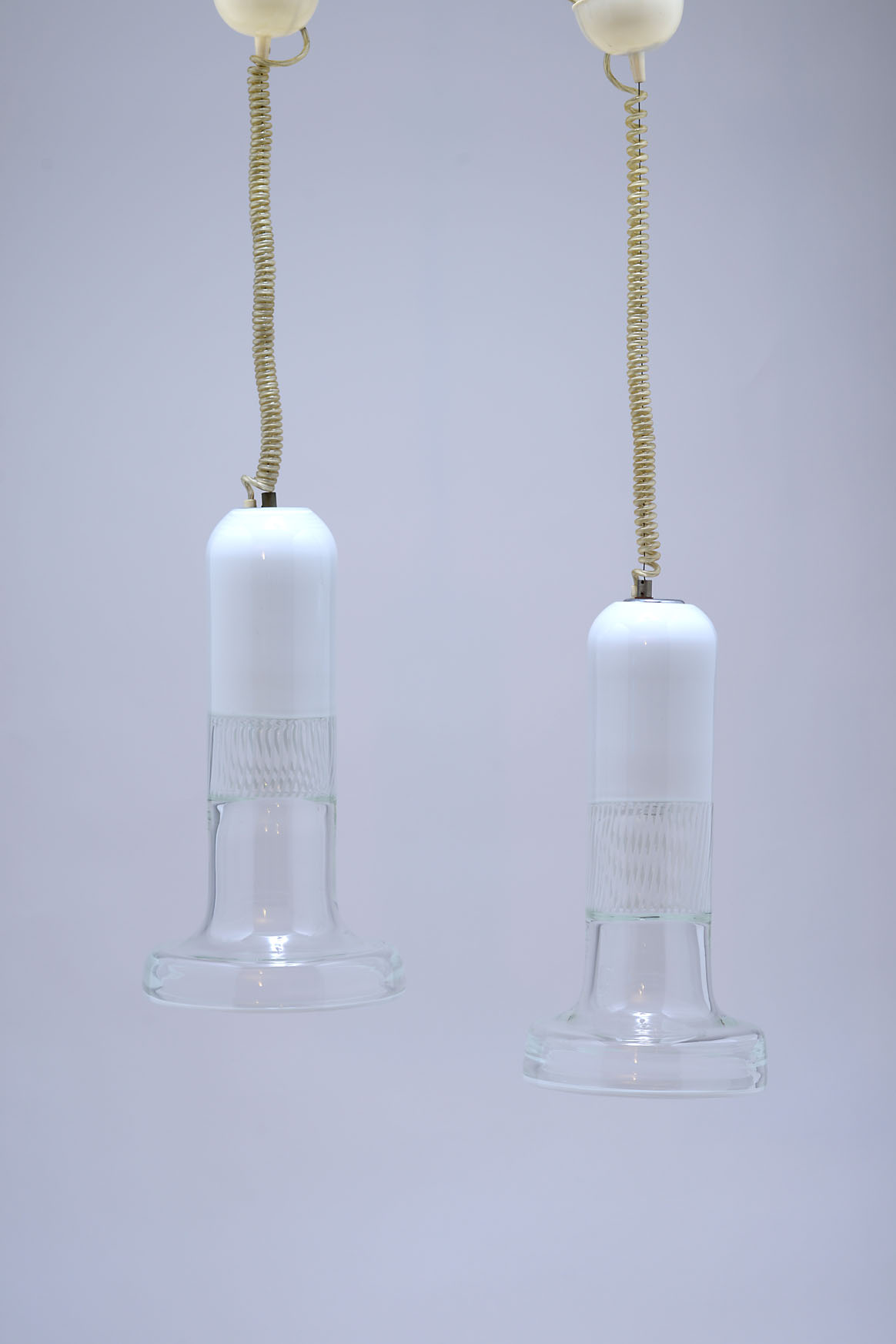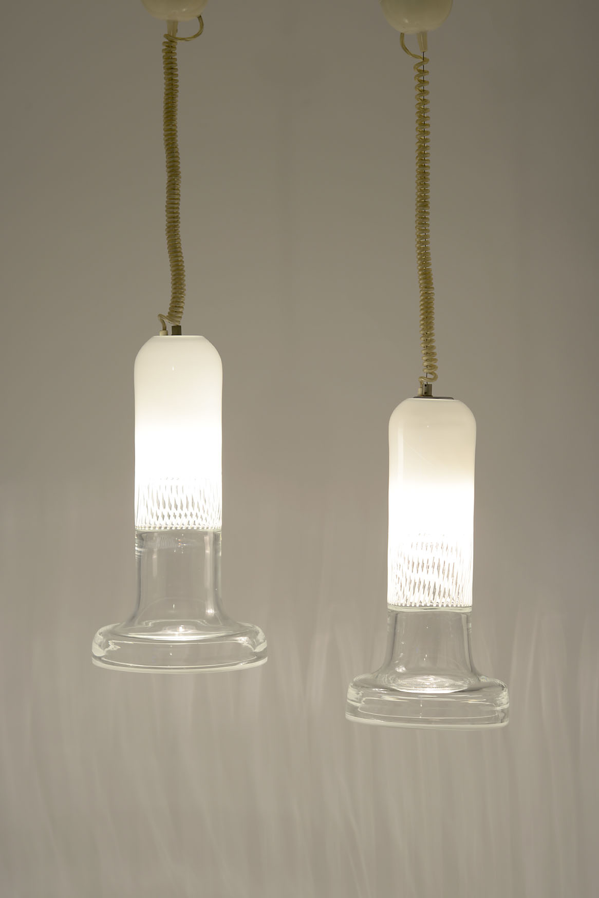 A pair of blown glass suspension lamps with triple overlay and white applied rim. Steel suspension cable and curled electric cord. Marked Leucos.