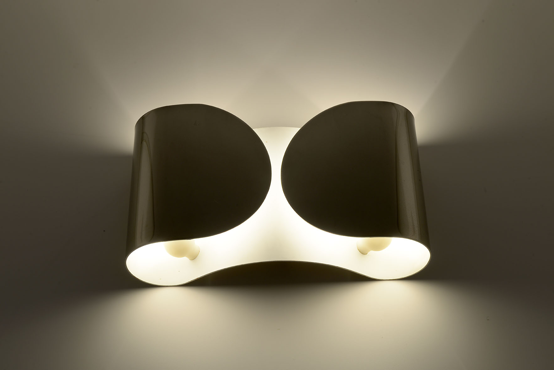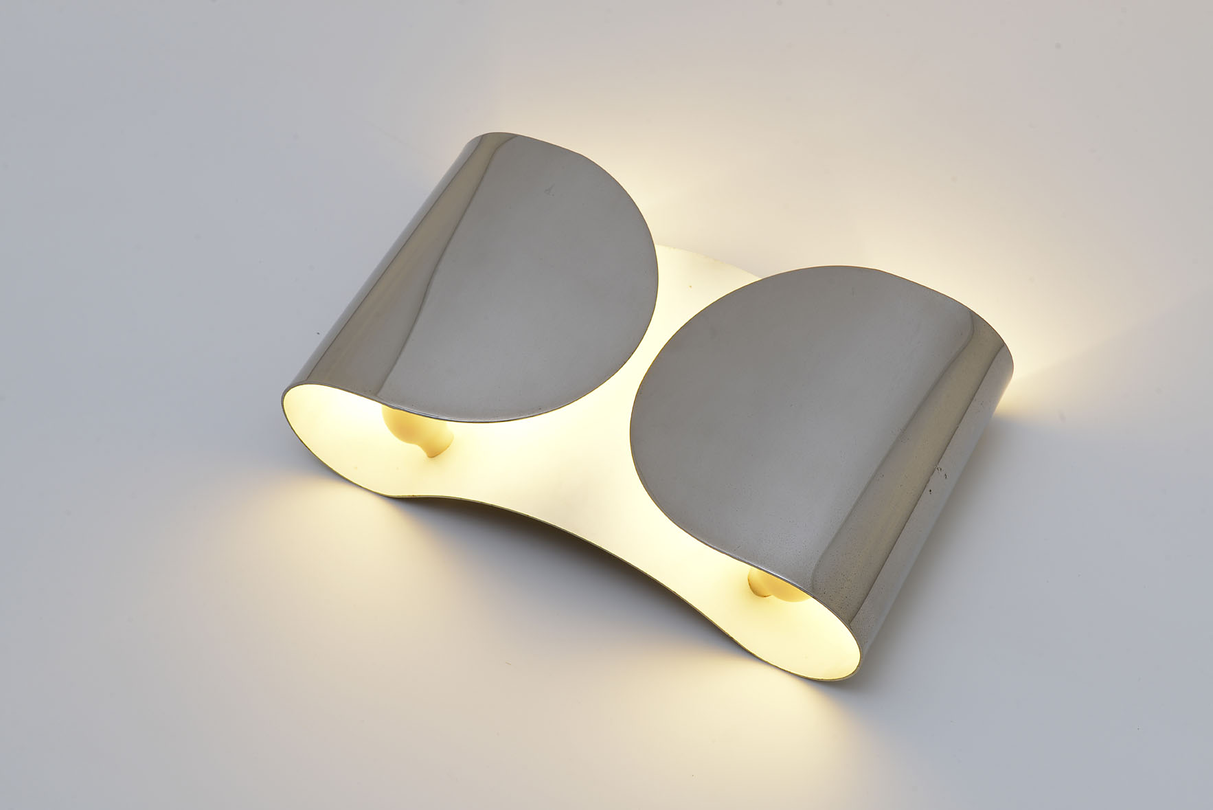Chrome-finished applique in the form of a folded leaf inside which there are two bright lights. In its extreme simplicity the decorative wall lamp creates a discrete and elegant form of illumination.