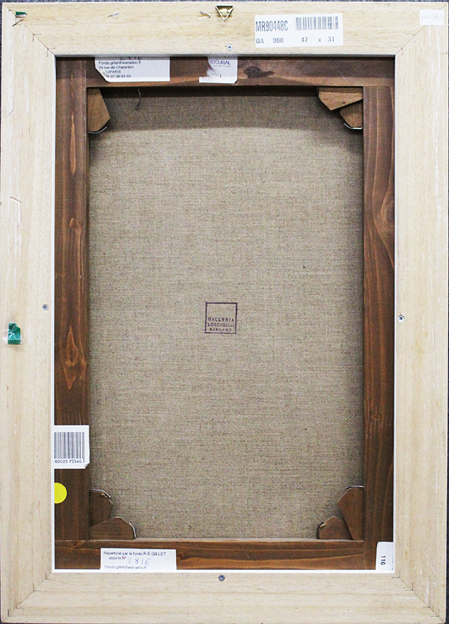 ROGER EDGAR GILLET, anni '90, olio su carta intelata, dim 51x35. Al fronte: firma in basso a destra. Al verso: timbro Galleria Lorenzelli Bergamo, etichetta archivio dell'artista con numero d'archivio 2816. Opera con cornice.