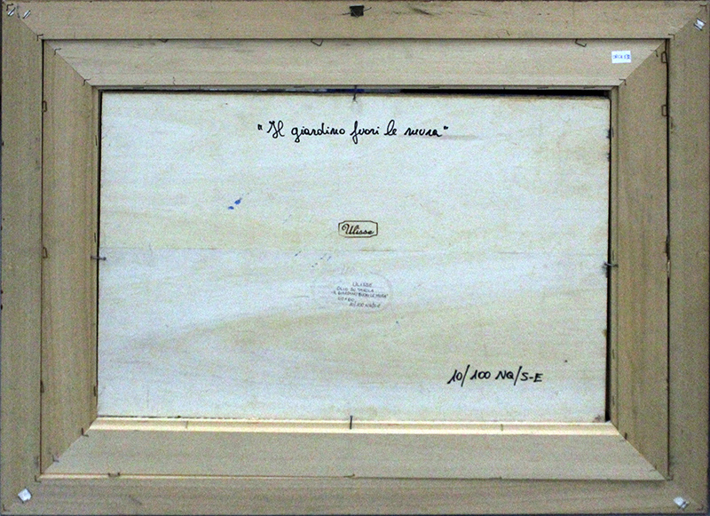 ULISSE, "Il giardino fuori le mura", olio su tavola, dim 40x60. Al fronte: firma in basso a sinistra. Al verso: titolo, firma, tecnica, dimensione, numero archivio: 10/100 NQ/SE. Opera con cornice.