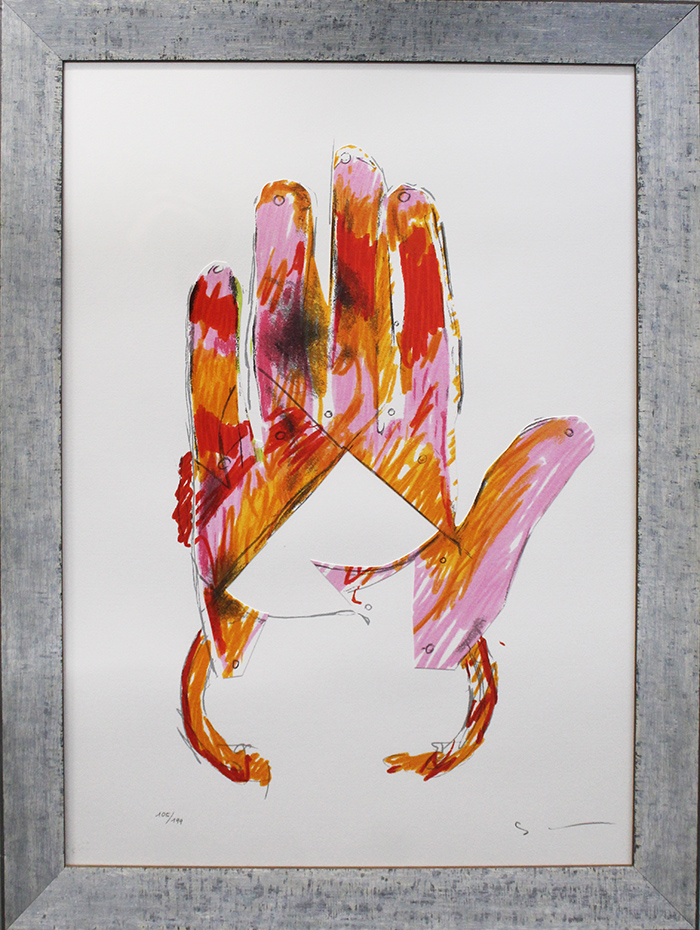 MARIO SCHIFANO, "Mano", Anni '90, Serigrafia materica su cartoncino, Dim. 70x50, Al fronte: in basso a sinistra tiratura 105/199, firma in basso a destra. Opera con cornice.