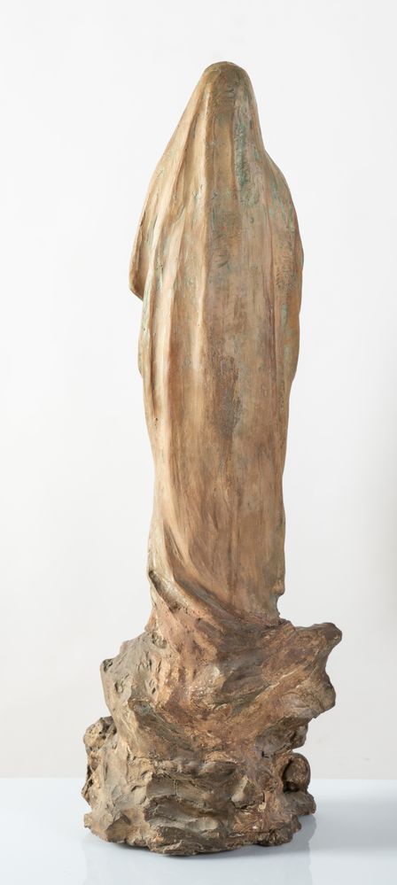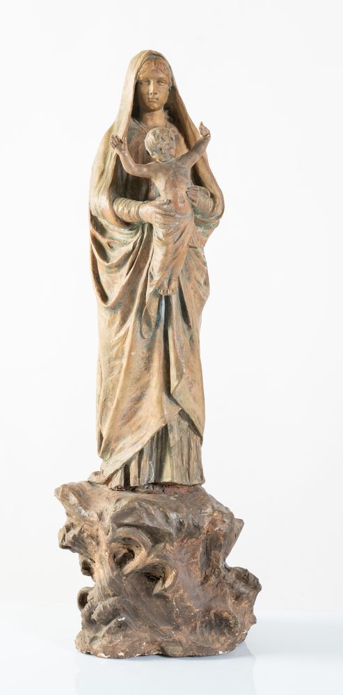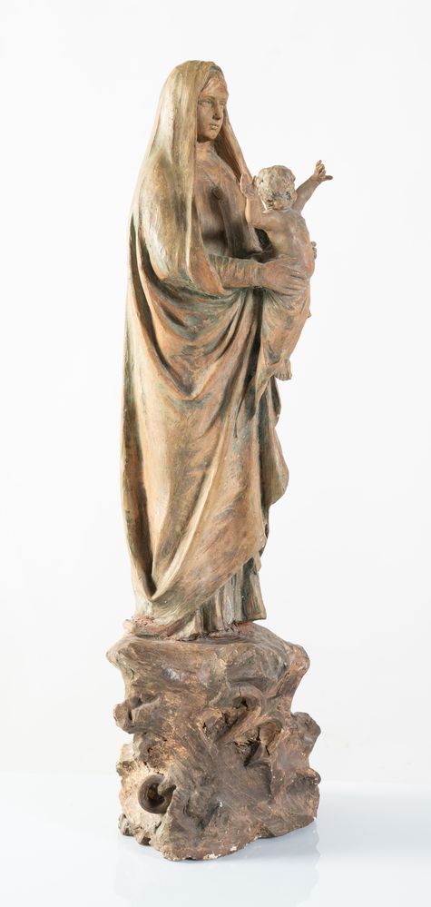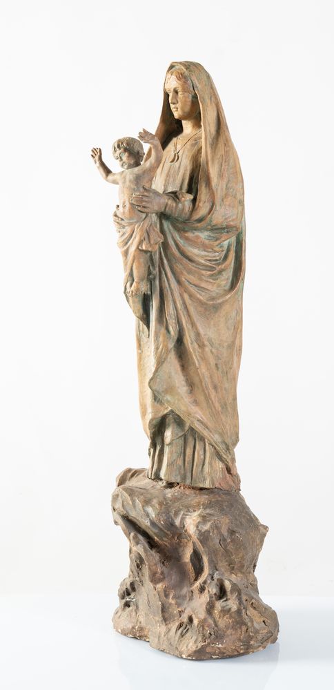 Scultura in terracotta, raffigurante Madonna con Bambino. Arte emiliana, fine del XIX secolo - inizio del XX secolo. Cm 67x23x15. (lievi difetti)