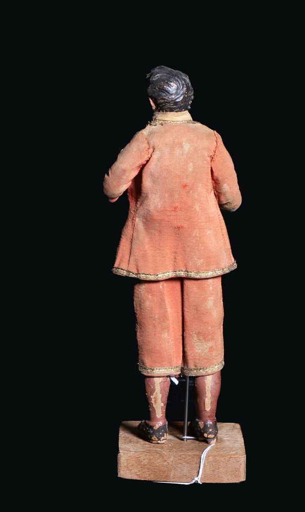 Figura da presepe in cartapesta e stoffa. Arte napoletana, XIX secolo. Cm 27x11x10. (difetti)