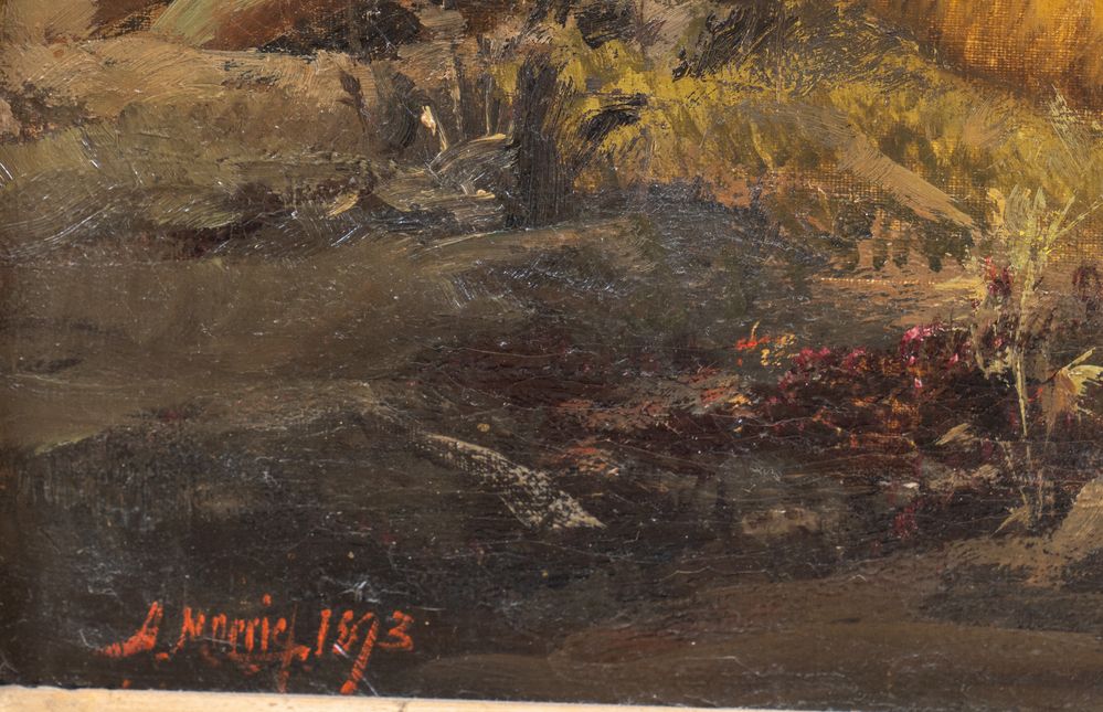 Maestro del XIX secolo. "Gregge", 1893. Olio su tela. Cm 72x91. Opera firmata e datata in basso a sinistra con firma non decifrata e 1893.