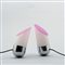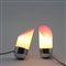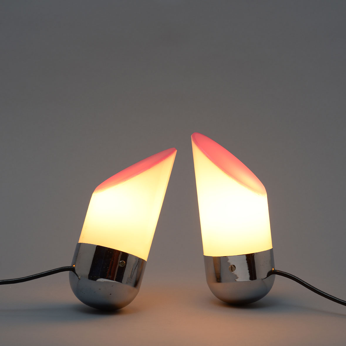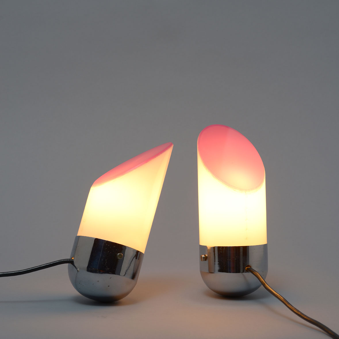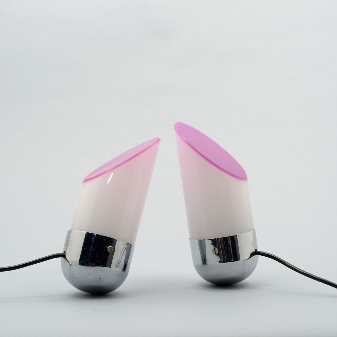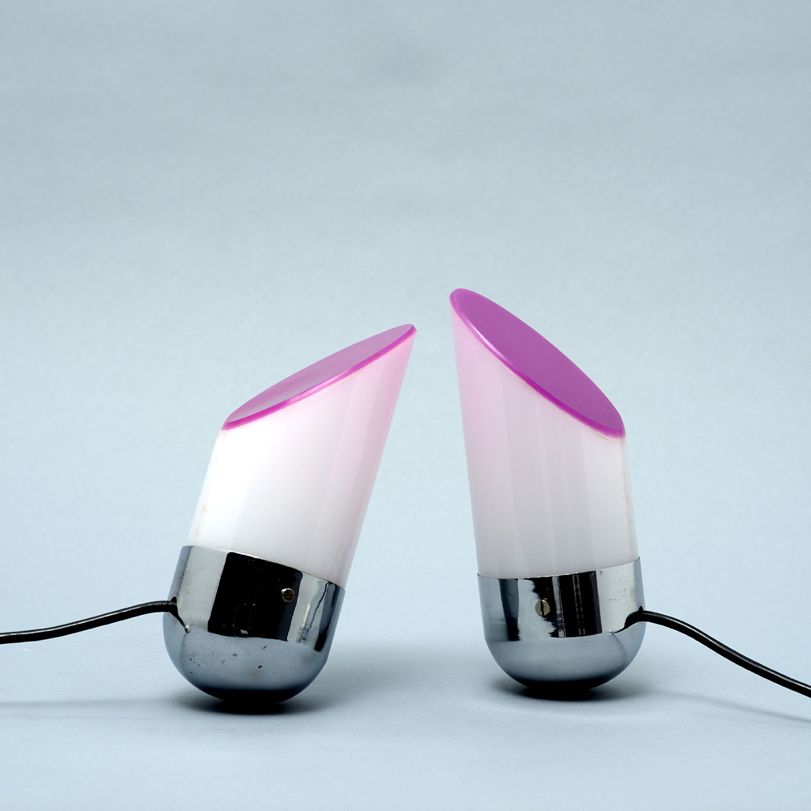 A pair of balancing lights with chrome-finished ogival bases weighted down internally, white methacrylate cylindrical diffusers cut at 45° at the top and closed by purple-coloured methacrylate.