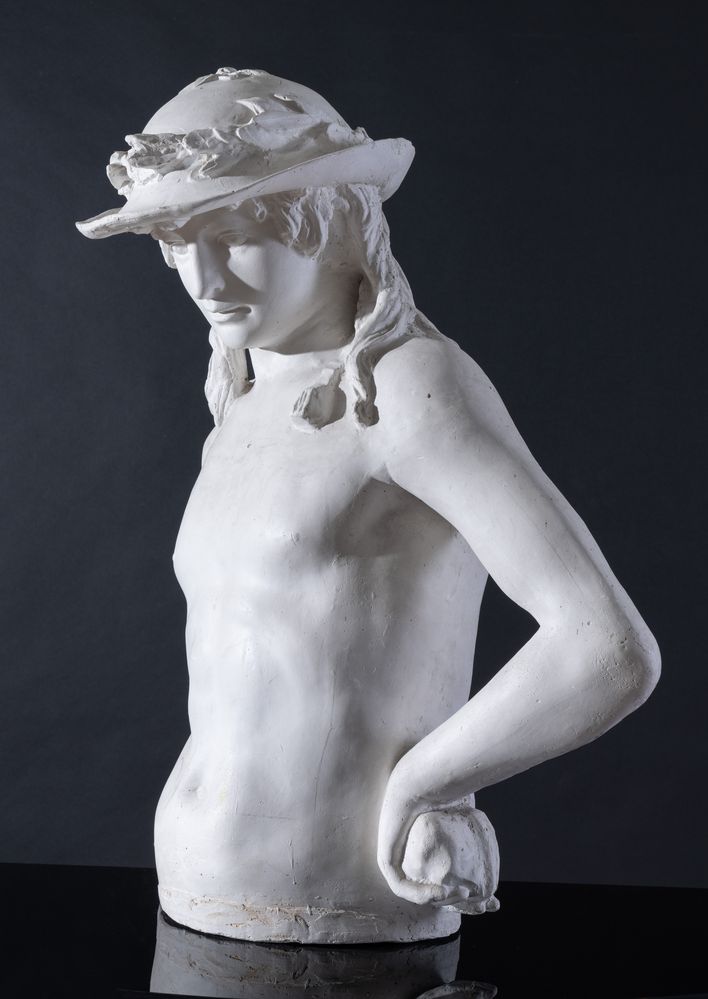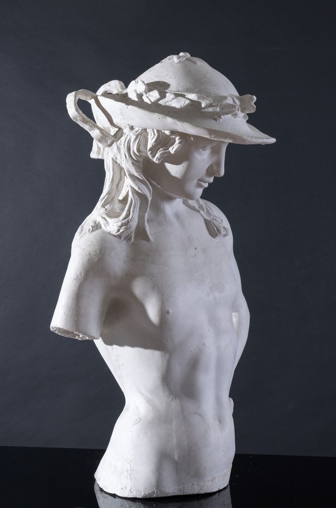 Manifattura italiana del XIX secolo - XX secolo. Calco in gesso raffigurante il busto di David, copia da Donatello. Cm 72,5x56x35. (difetti)
