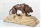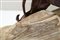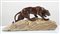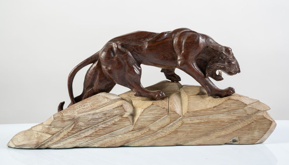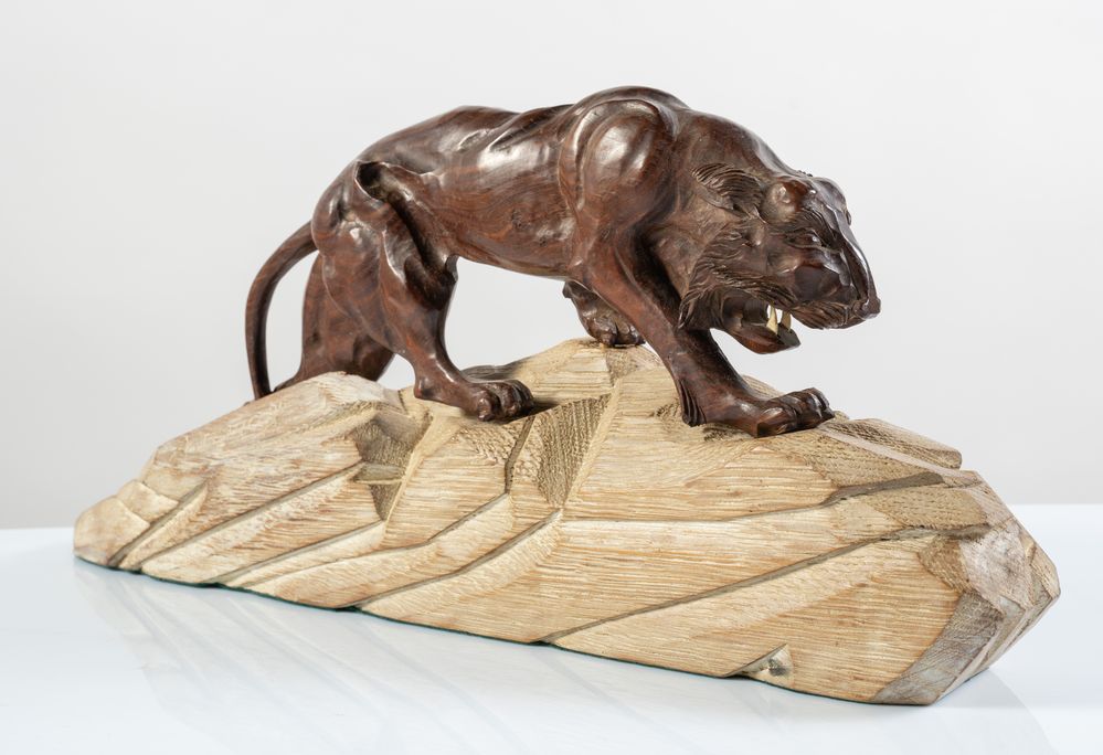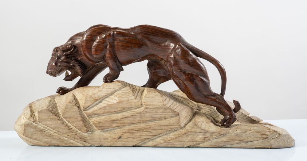 Scultura in legno bruno rossiccio e legno chiaro, raffigurante tigre che cammina su una roccia, preparandosi alla lotta. Cm 25x58x9. Firma indecfrata sulla base.