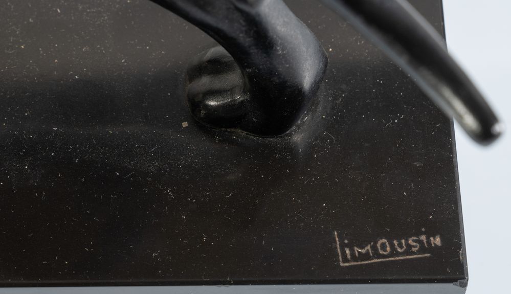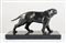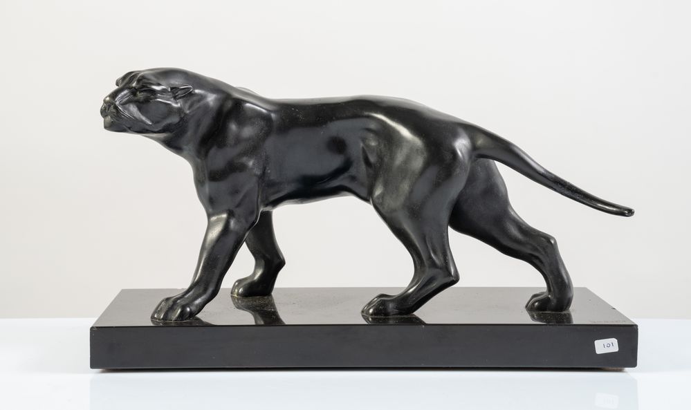 JACQUES LIMOUSIN Scultura in bronzo a patina nera, raffigurante pantera che cammina. Base in onice e marmo nero. Cm 22,5x40x16. Firma incisa sulla base Limousin. (difetti sul marmo)