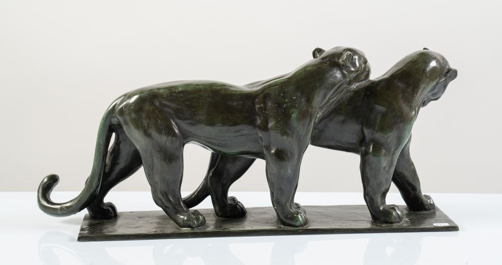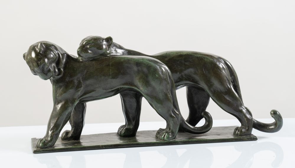 ANDRE' VINCENT BECQUEREL (Saint André Farivillers 1893 - Parigi 1981) attr. Scultura in bronzo raffigurante coppia di leonesse. Basamento in bronzo, patina scura con riflessi verdastri e segni del tempo. Cm 20x45,5x10,5. Circa 1930. Firma parzialmente leggibile incisa sulla base.