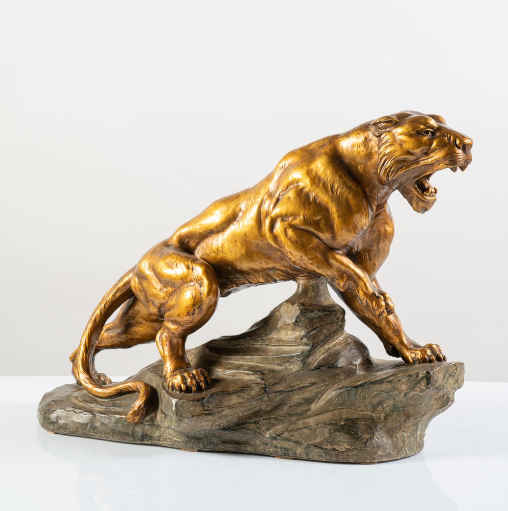 GUSTAVE VAN VAERENBERGH (Gent 1873 - Schaarbeek 1927). Scultura in caolino con patina in bronzo dorato raffigurante leonessa che ruggisce. Cm 40x56x22. Opera firmata alla base Varenbergh.