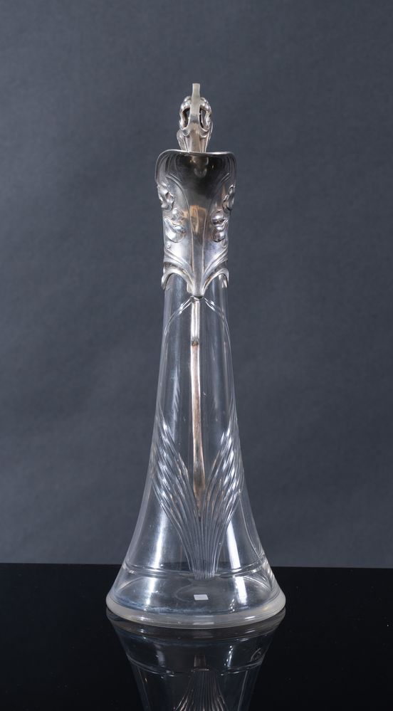Württembergische MetallwarenFabrik, 1906. Claret Jug. Brocca in silver-plate, con vetro d'origine. Modello n. 308. Cm 38,5x18,5x15. Sotto la base reca punzoni WMF.