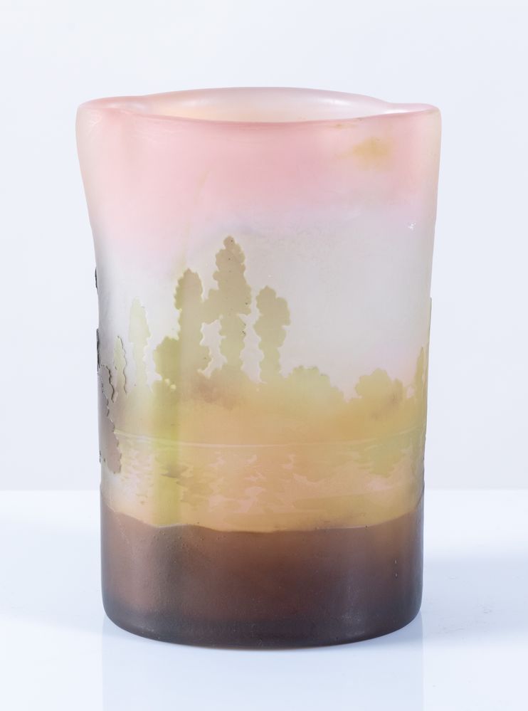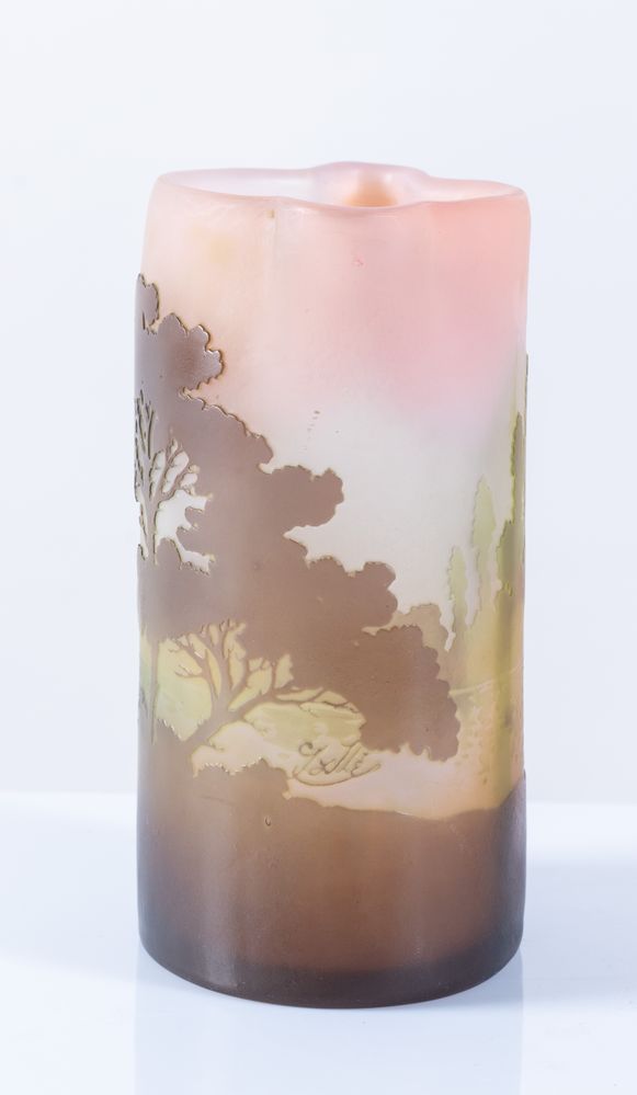 ÉMILE GALLÉ (1846 - 1904), Francia. Vaso a forma ovale in vetro lavorato a cammeo con decoro di paesaggio lacustre. Cm 16,5x11,5x8. Opera firmata Gallé. (difetti)