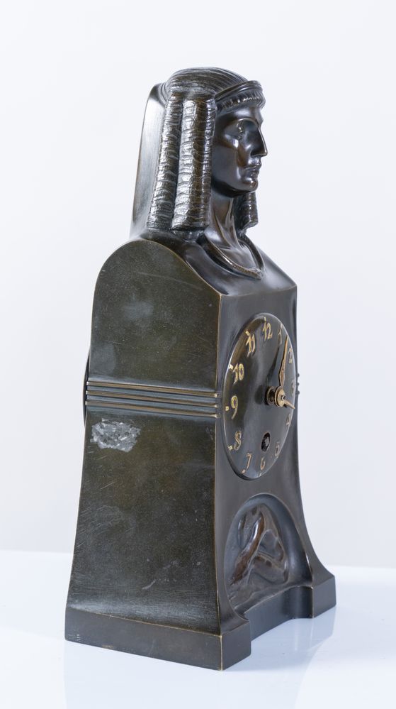 BAGDONS. Scultura simbolista in bronzo con orologio con numeri arabi, sormontato da testa di sfinge con al collo serpente che si morde la coda e alla base giovane donna distesa. Al retro firma T. Bagdons, 1902. Cm 26.5x13x8.