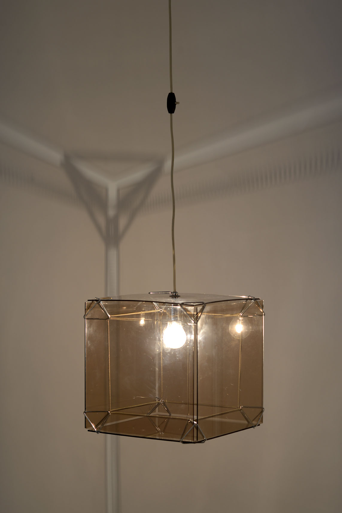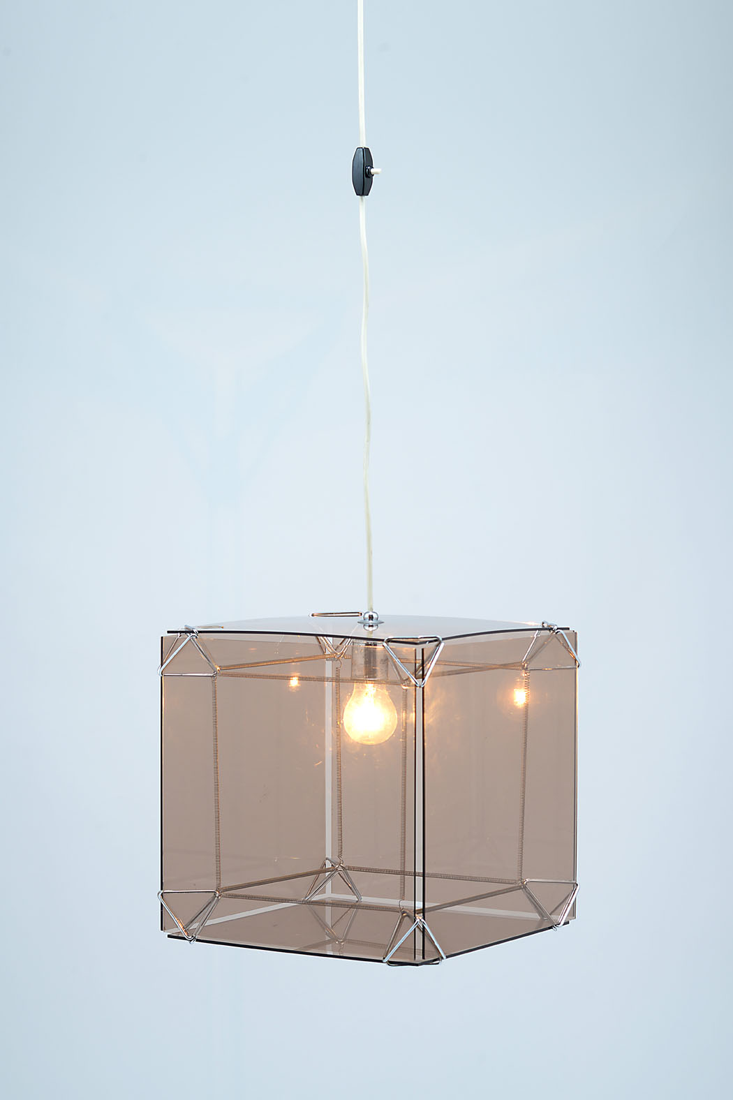 A cubic lamp with Perspex sides joined at the corners by chrome-plated metal joined together internally by springs. E27 light bulb bases.