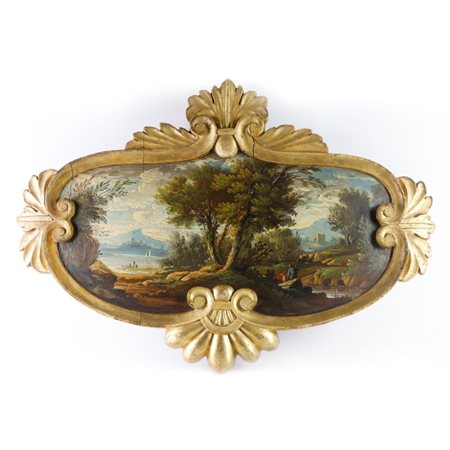 54 x 37 x 4 cm con al centro dipinta ad olio scorcio di esterno con alberi, montagne e lago.