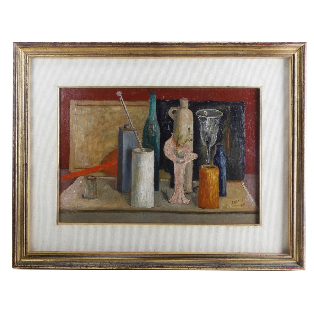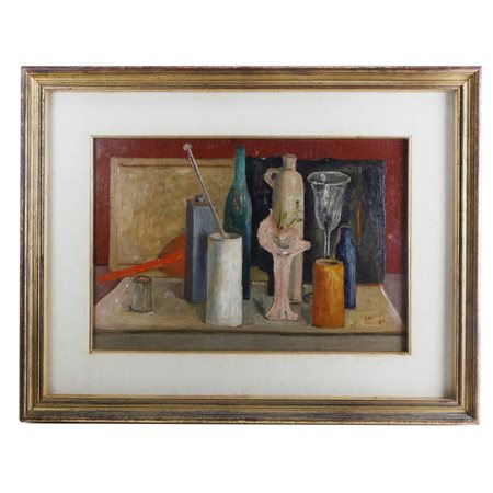 FRANCESCO DE ROCCHI (Saronno, 1902 - Milano, 1978) Natura morta con bottiglie e bicchieri dipinto ad olio su tavola 28 x 41 cm