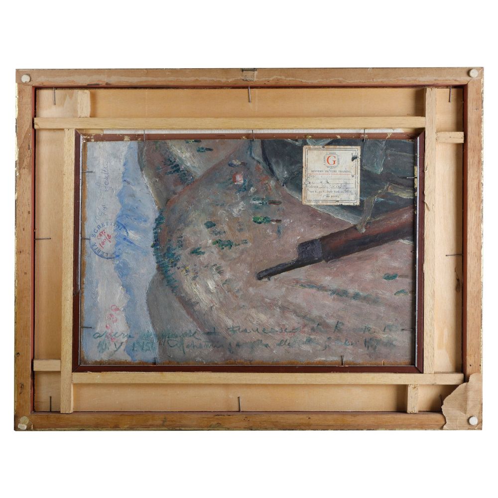 dipinto ad olio su tavola 28 x 41 cm con al retro scorcio di paesaggio con dedica in cornice, firmato e datato al fronte in basso a destra.