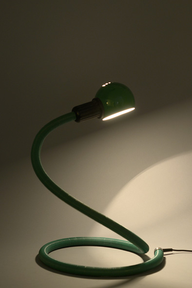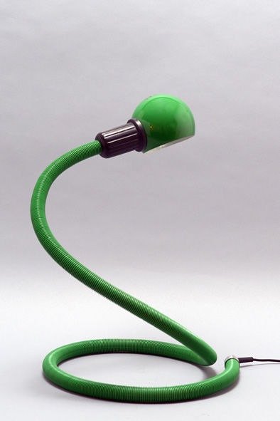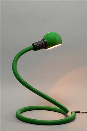 Fully adjustable lamp, flexible polymer body with swivelling reflector in lacquered aluminium. Lamp is representative of the design of the 1970's for its ready-made and ergonomic characteristics. The lamp is composed exclusively of a flexible metal PVC-covered tube allowing the shape and direction to be modified.