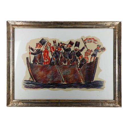 FRANZ BORGHESE (Roma, 1941 - 2005) Figure entro la barca, multiplo su carta 50 x 70 cm