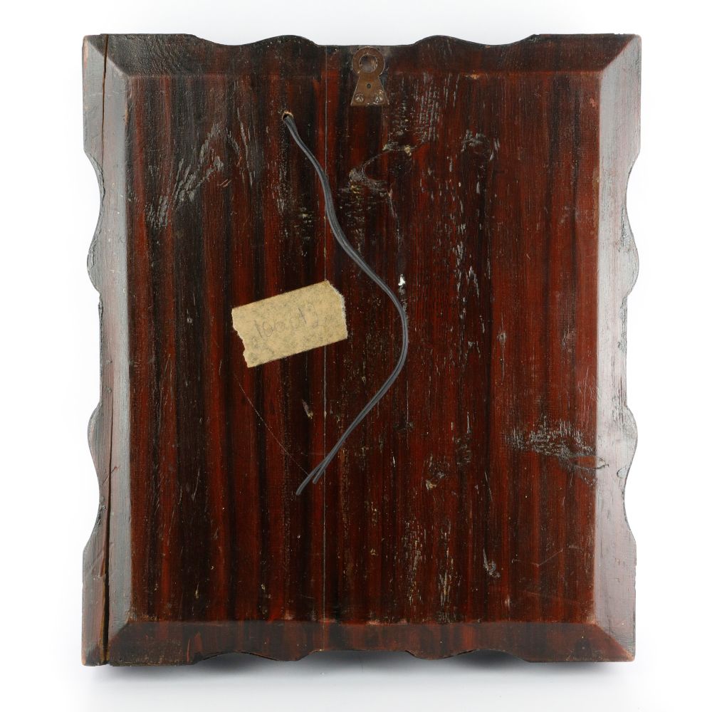 olio su tavola 26,5 x 22 x 2 cm con rizza in metallo argentato incisa a motivi geometrici, entro cornice in legno dorato e teca in vetro