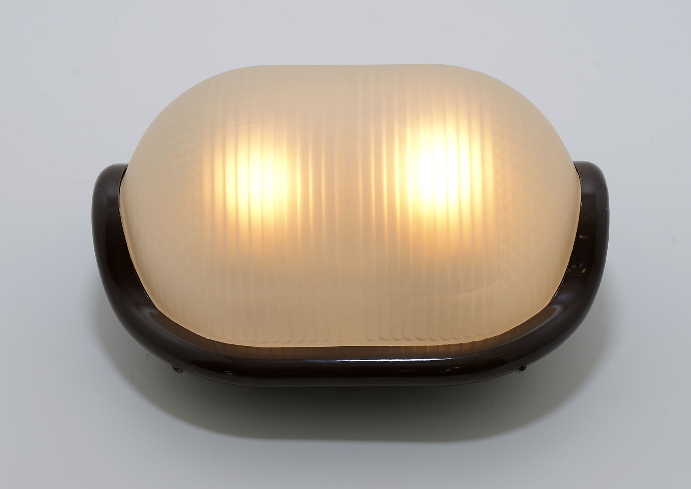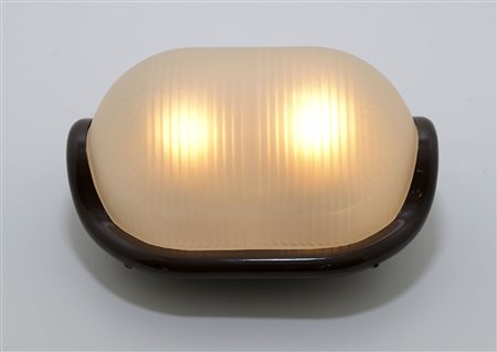 A versatile lamp with pressed sanded glass diffuser. The aluminium alloy body is liquid painted in a brown colour and which is fitted with two E27 light bulb mounts. Given mention by Compasso d'Oro in 1979.