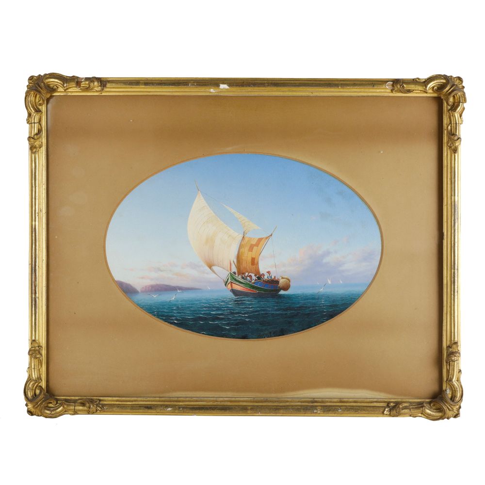 Scorcio di mare con isola e barca, gouache su carta 1880 21 x 30 cm